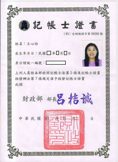 ◎個人擁有國家第一屆記帳士證書(95)台財稅証字第00266號。
